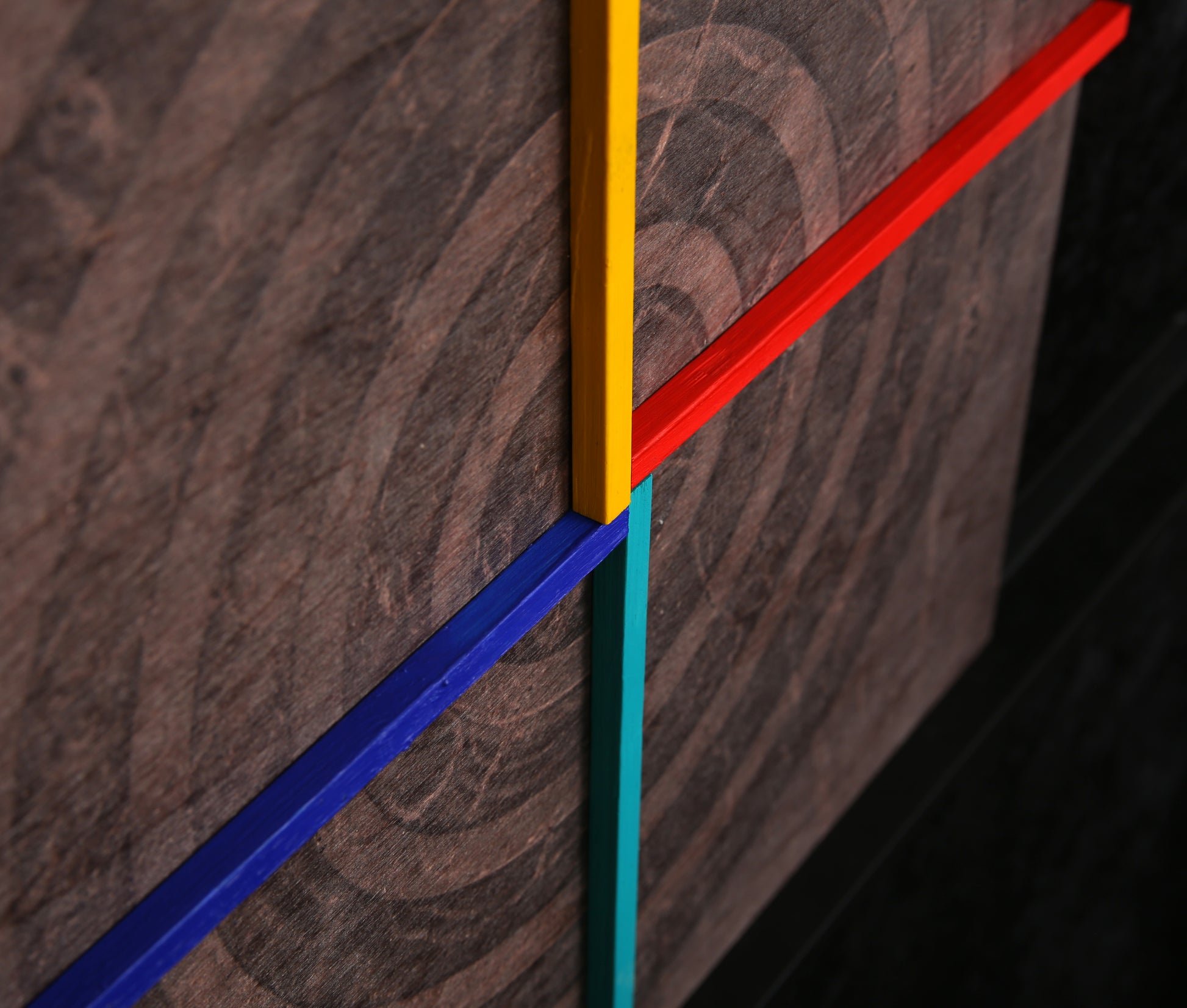 Relief made of wooden board and wooden rods (each hand-painted with acrylic paint)