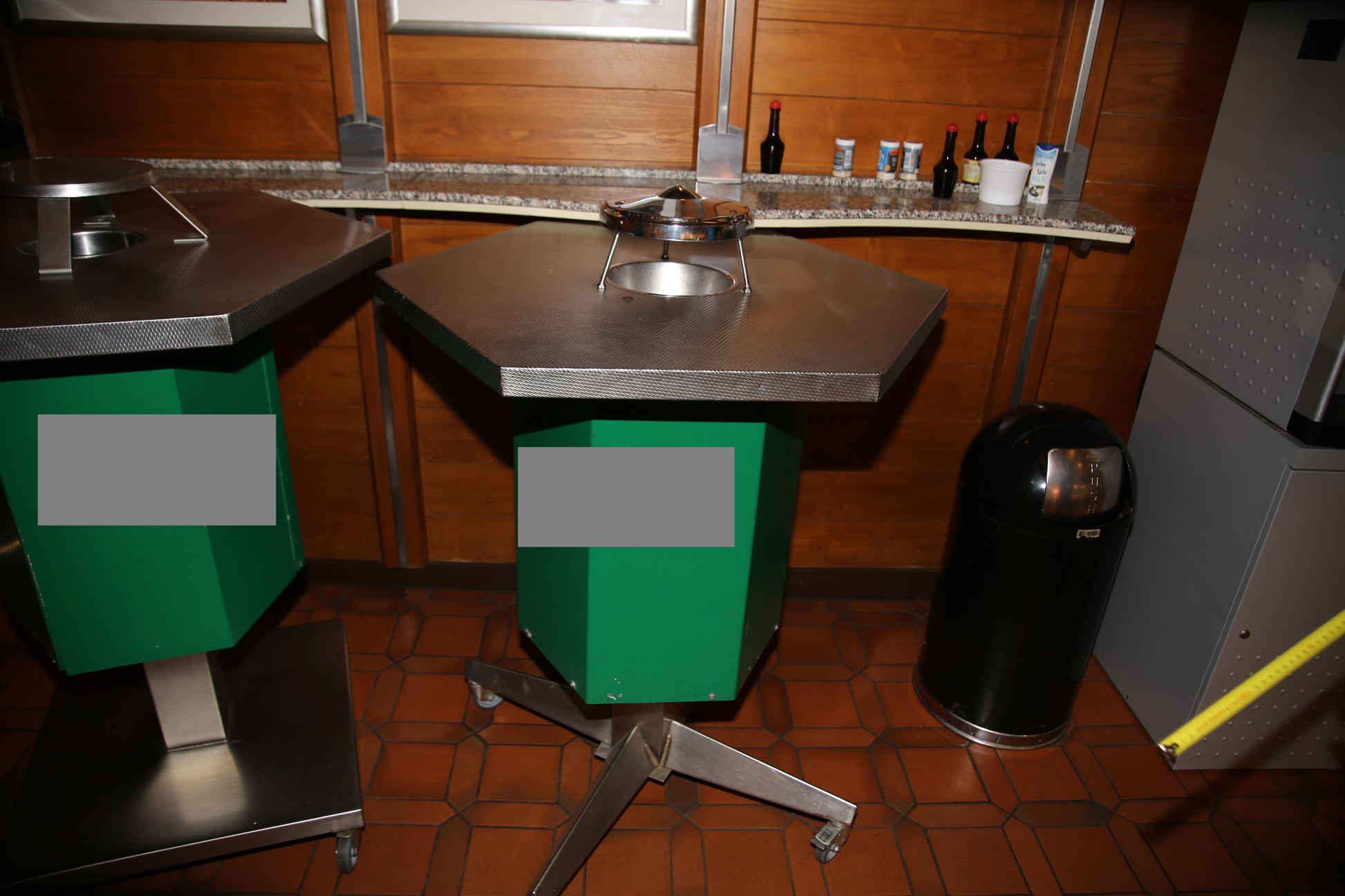 2 Stehtische - mit Werbeaufdruck (hier unkenntlich gemacht)