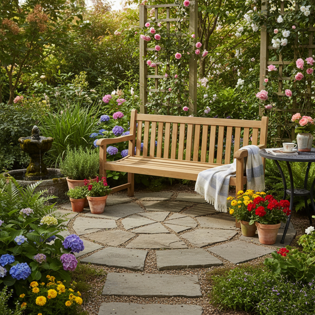 Teakholz Sitzgruppe - Tisch - Bank - 6 Stapelsessel + Kissen - NEU