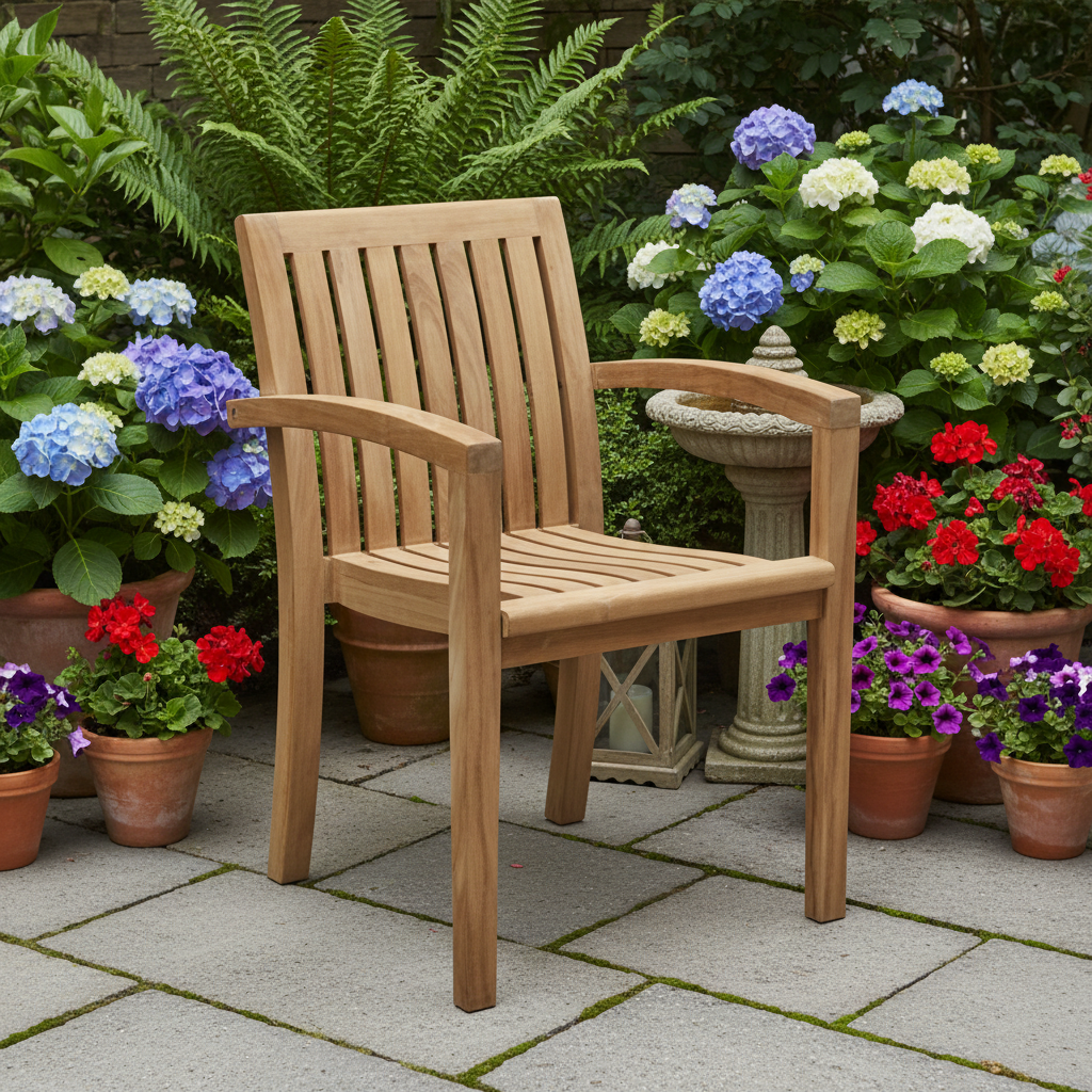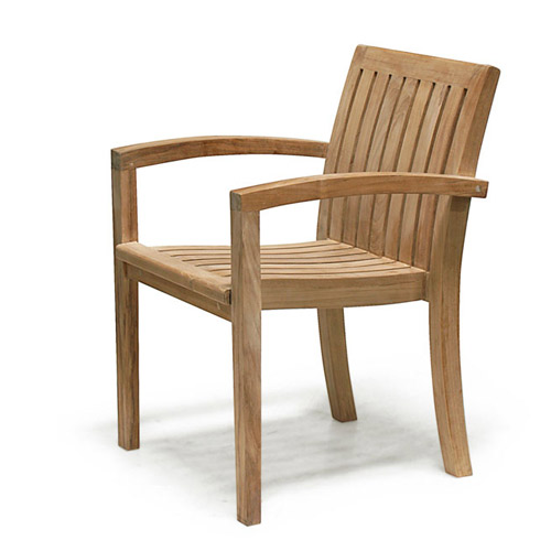 Wir bieten eine Teakholzgruppe bestehend aus einem Tisch, einer Bank und 6 stapelbaren Sesseln an.